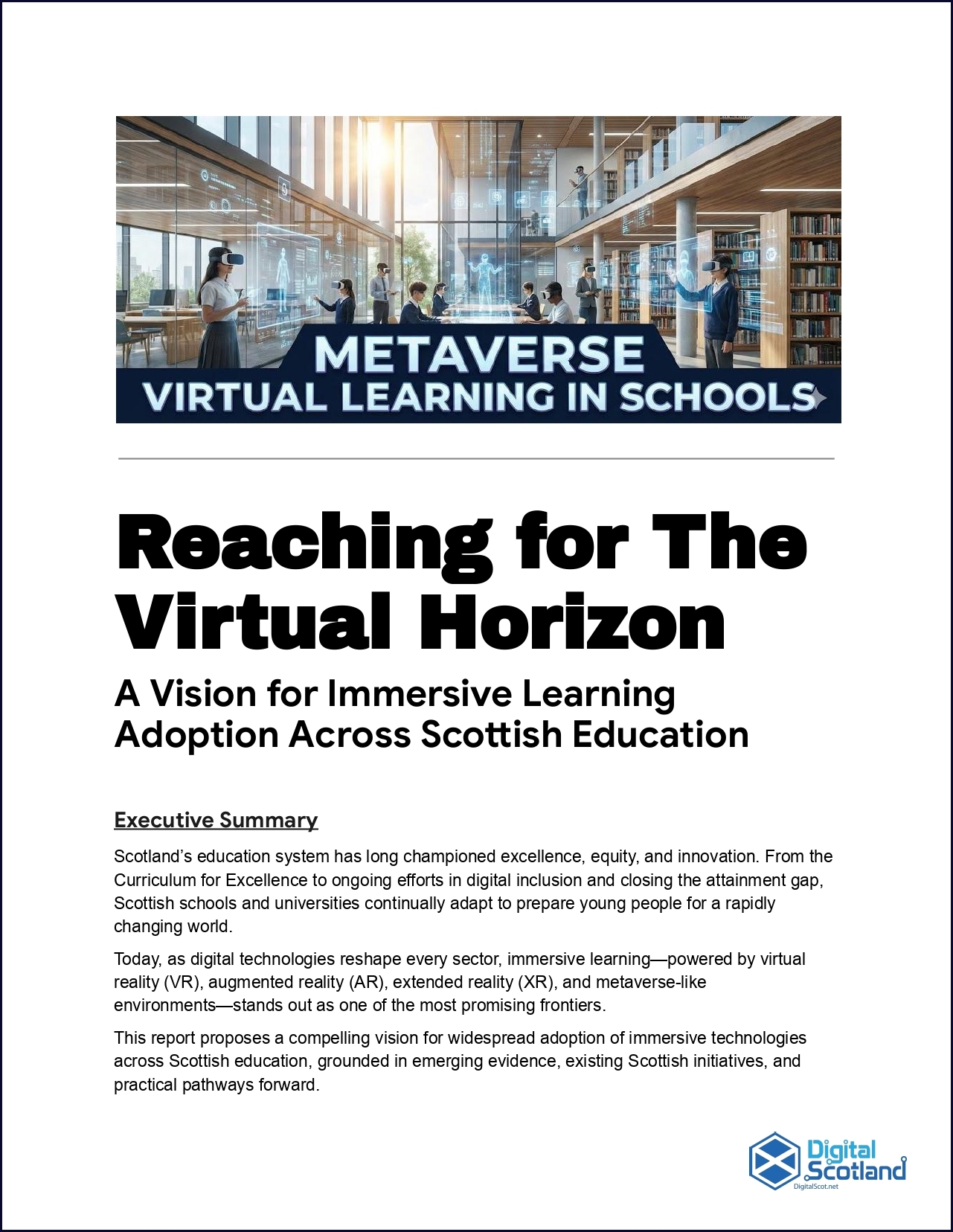 This report proposes a compelling vision for widespread adoption of immersive technologies across Scottish education, grounded in emerging evidence, existing Scottish initiatives, and practical pathways forward.